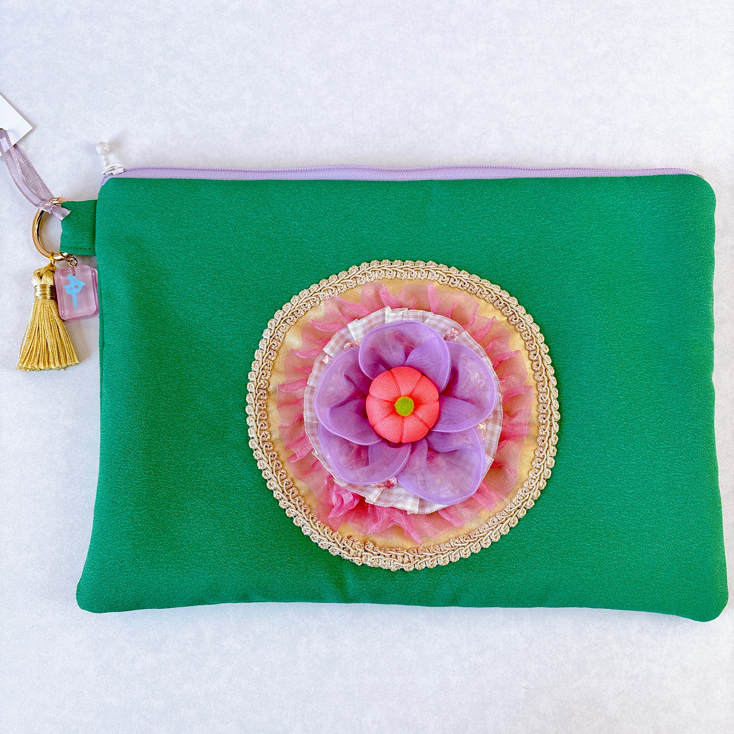 ネオンカラーの本体に様々な素材が組み合わされたモチーフがお花みたいで、もしもイーピンを知らなくてもとっても素敵なクラッチバッグです。