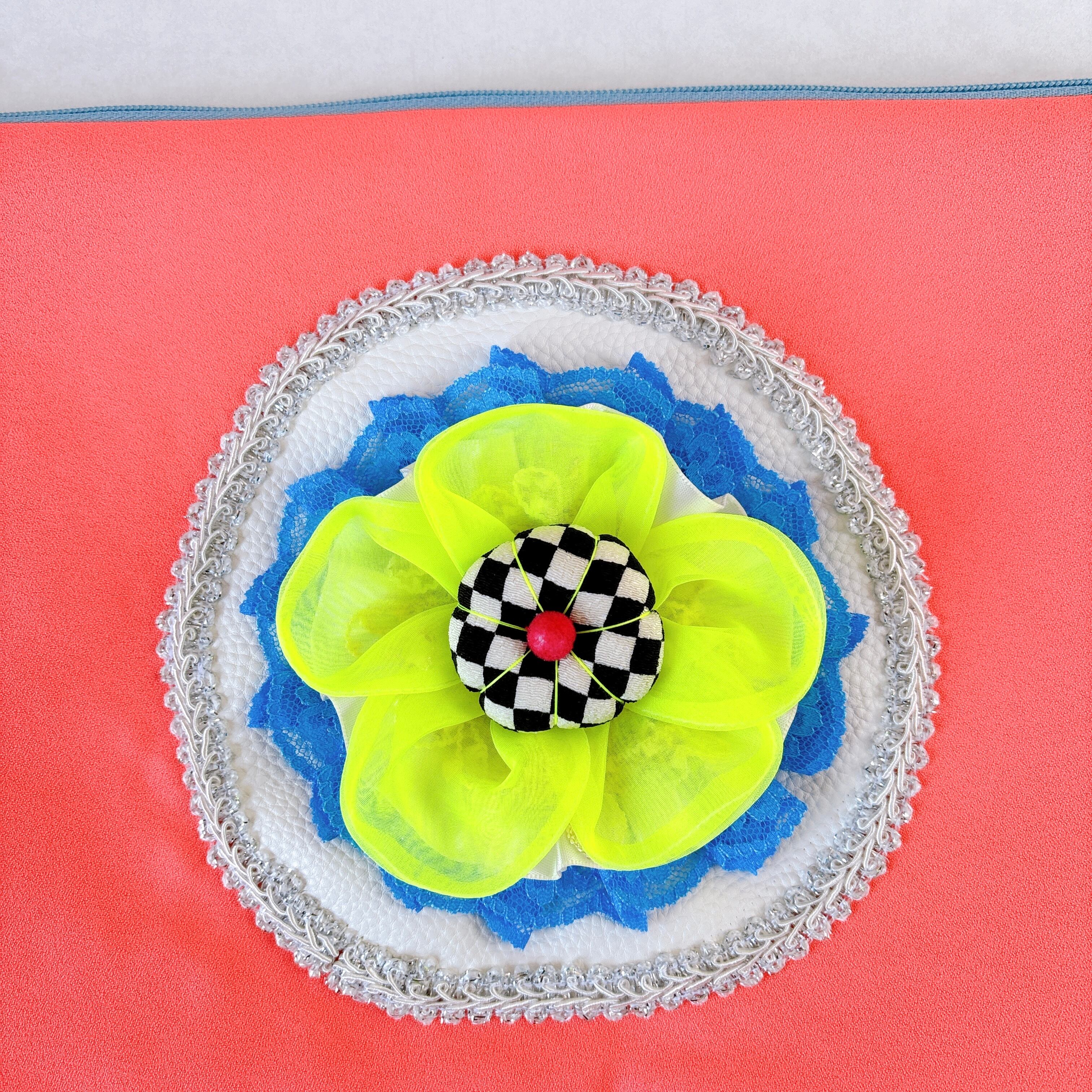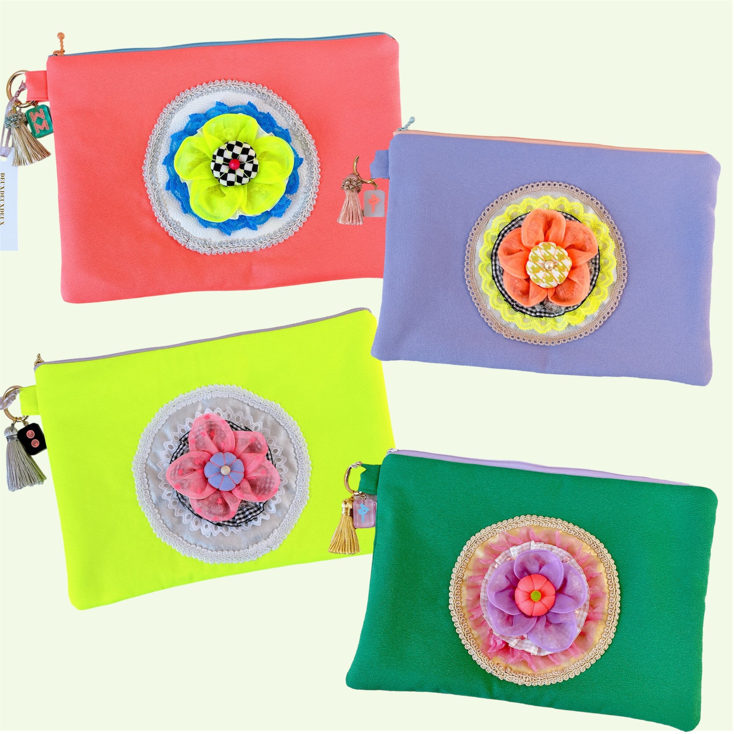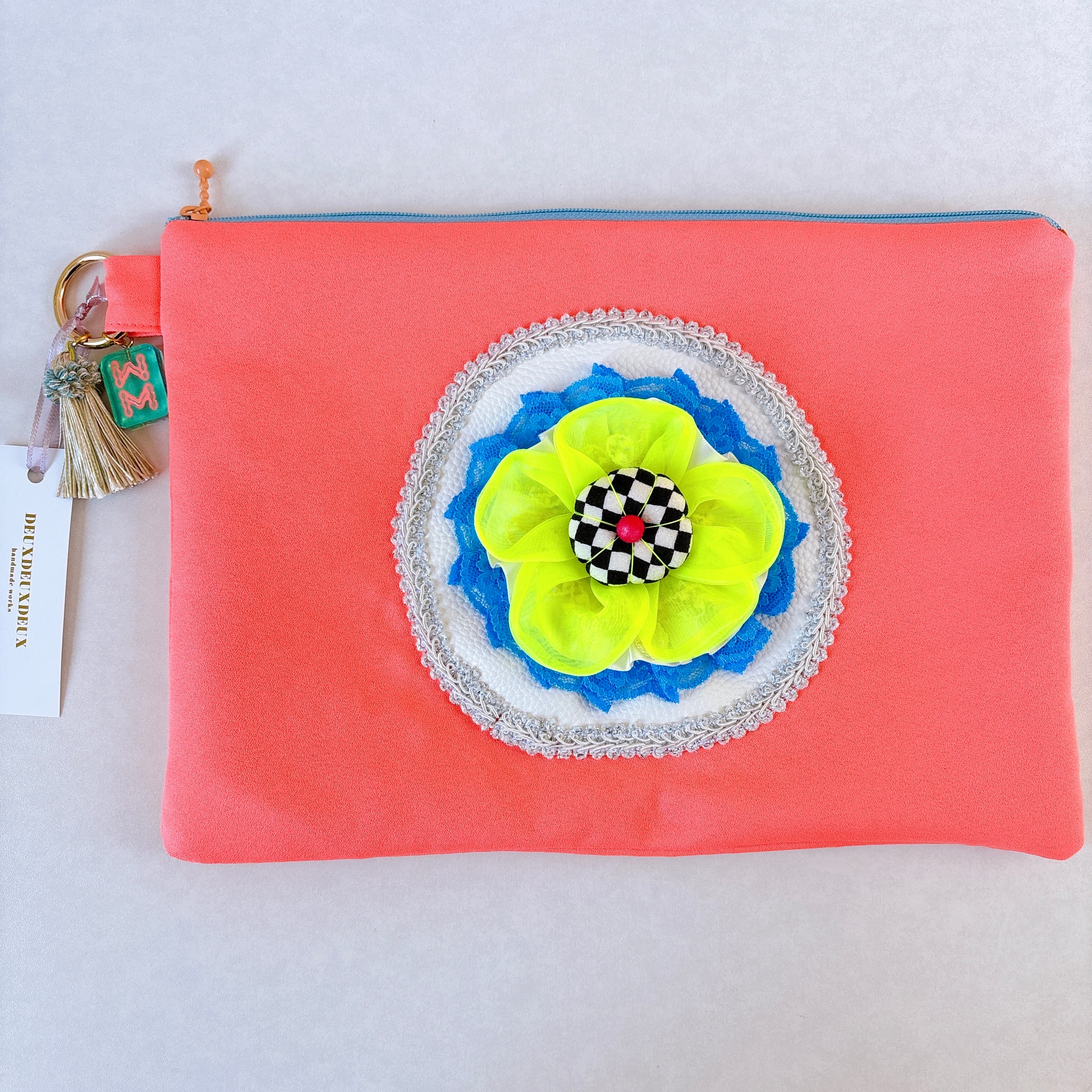 ネオンカラーの本体に様々な素材が組み合わされたモチーフがお花みたいで、もしもイーピンを知らなくてもとっても素敵なクラッチバッグです。