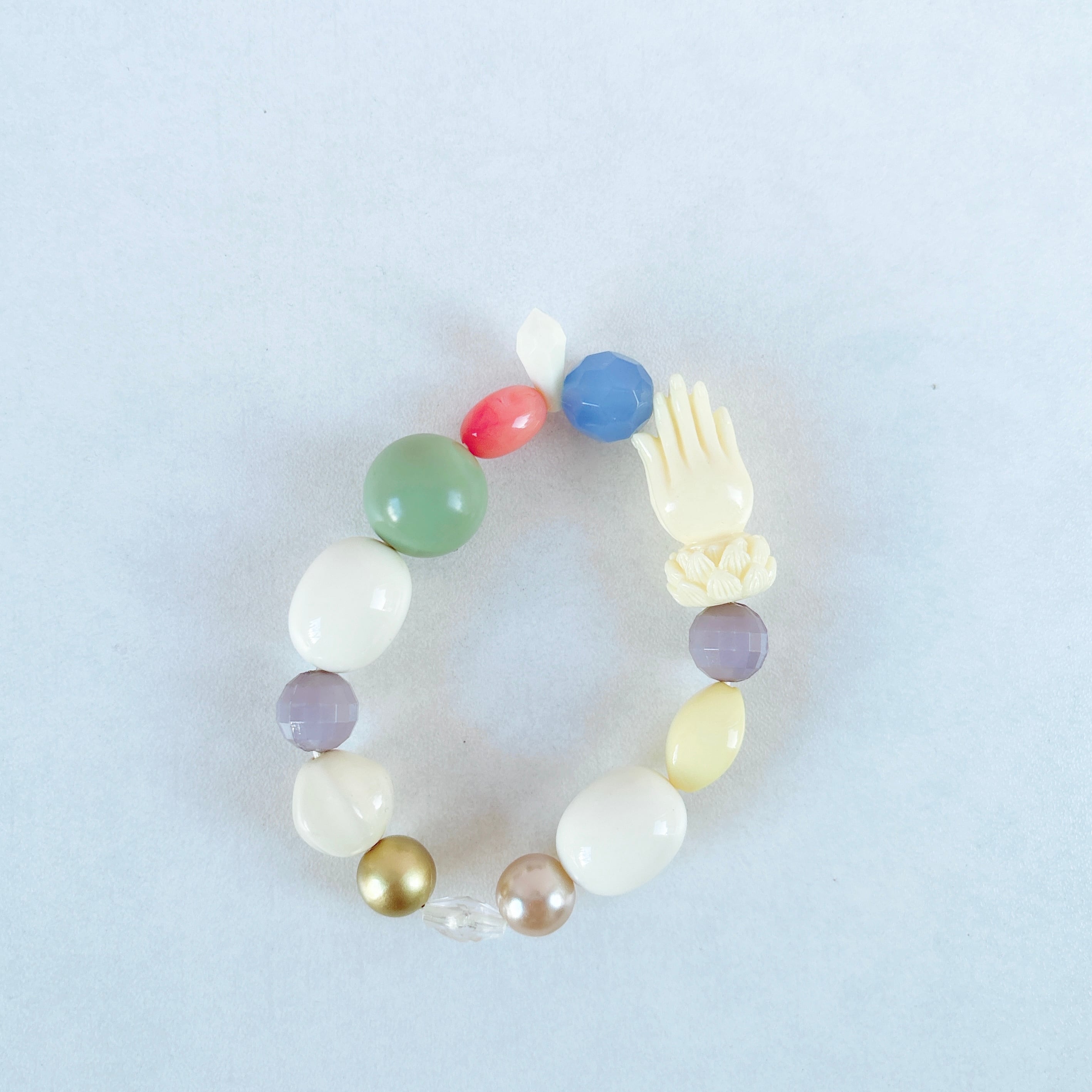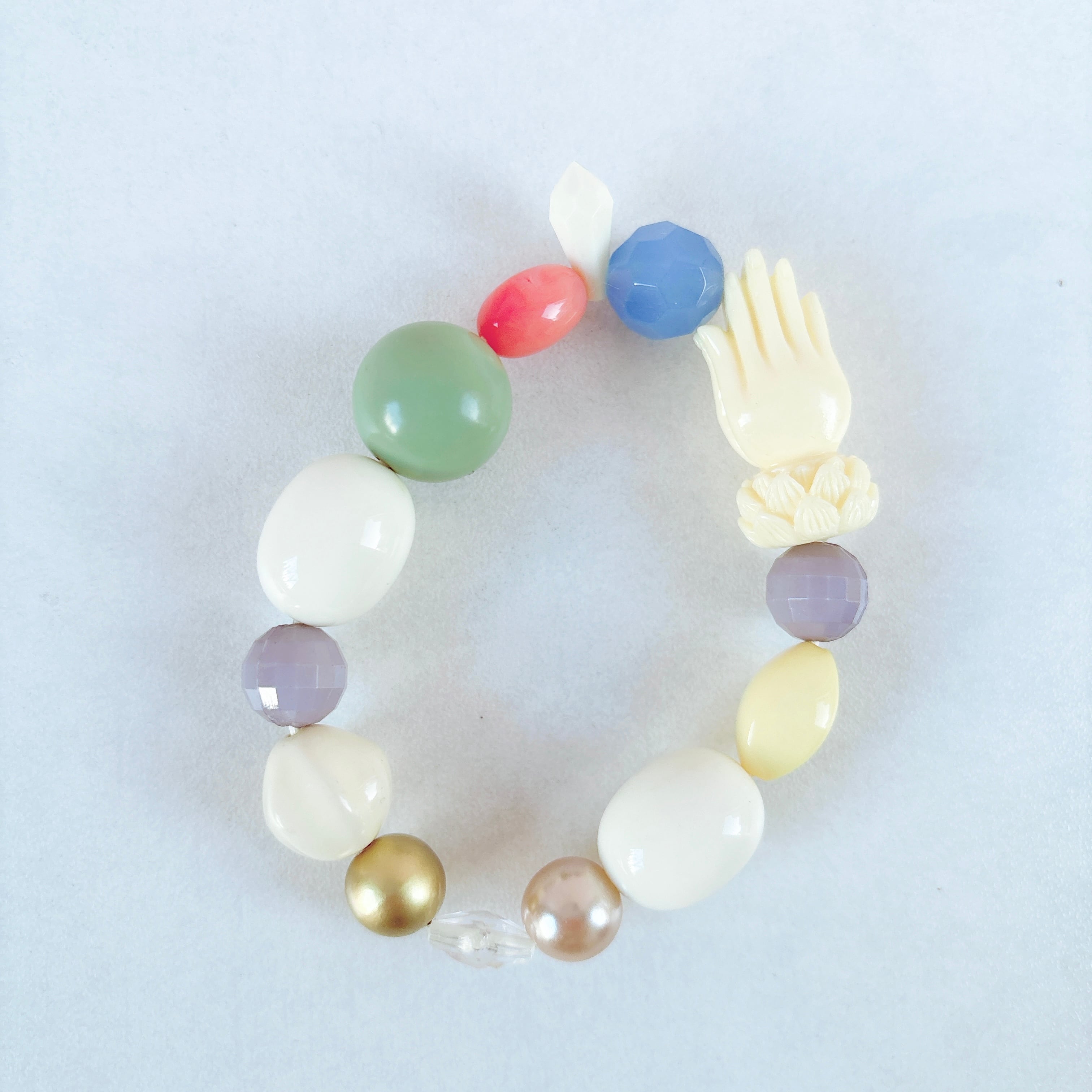 合掌している綺麗な手を主役に優しい色合いでまとめられた素敵なブレスレットです