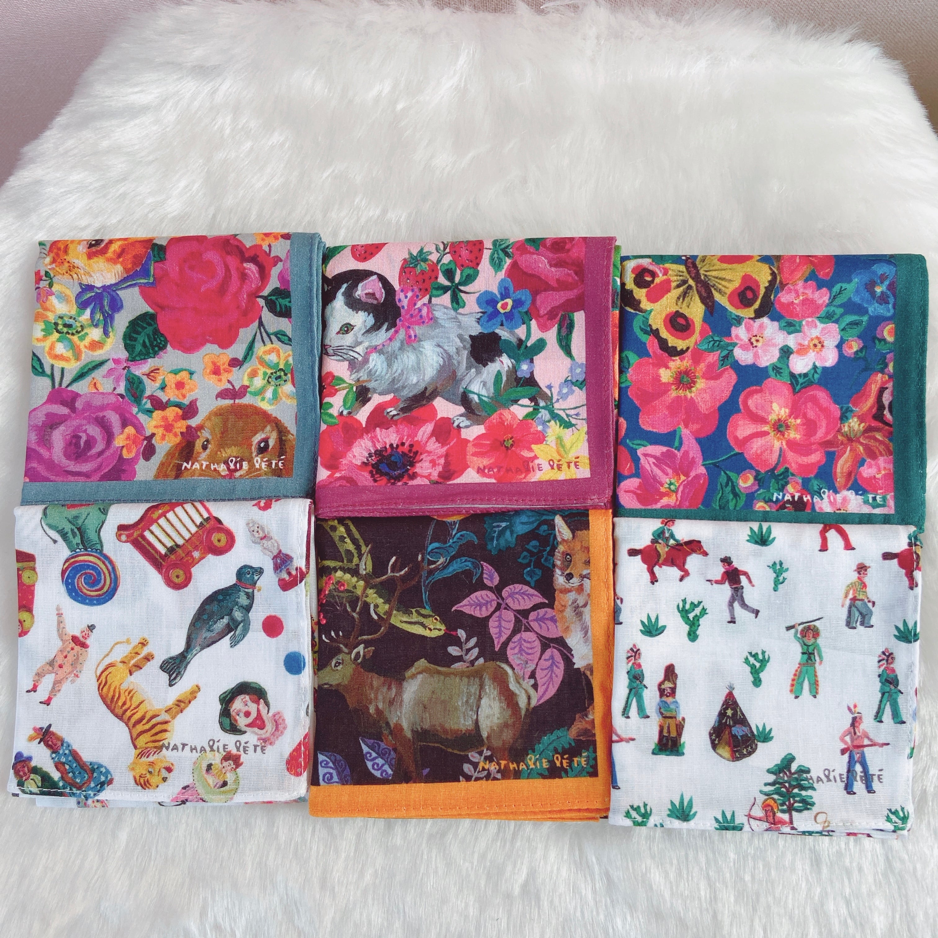 フランス・パリのアーティスト、ナタリー・レテの描く、ちょっと暗い森の動物たちのハンカチです。