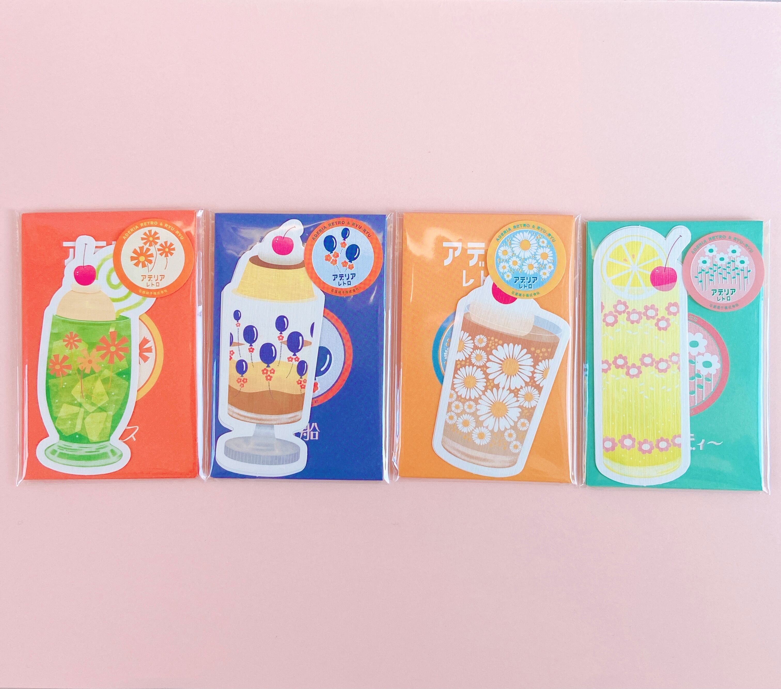 こちらはそんなアデリアレトロの人気の柄のグラスをモチーフにしたイラストの型抜き、グラスのイラストをパターンにした柄の2種類のミニカードと、グラスのパッケージをイメージした封筒のセットです。