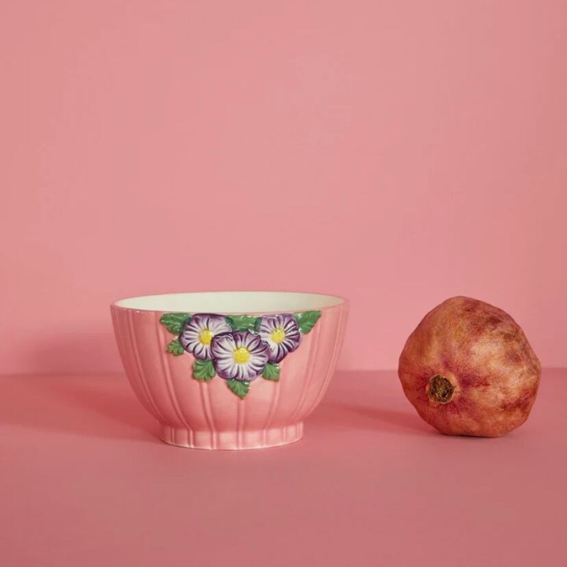 美しいヴィンテージのフラワーポットをイメージして作られたボウルは、可愛らしいお花で縁取られています。