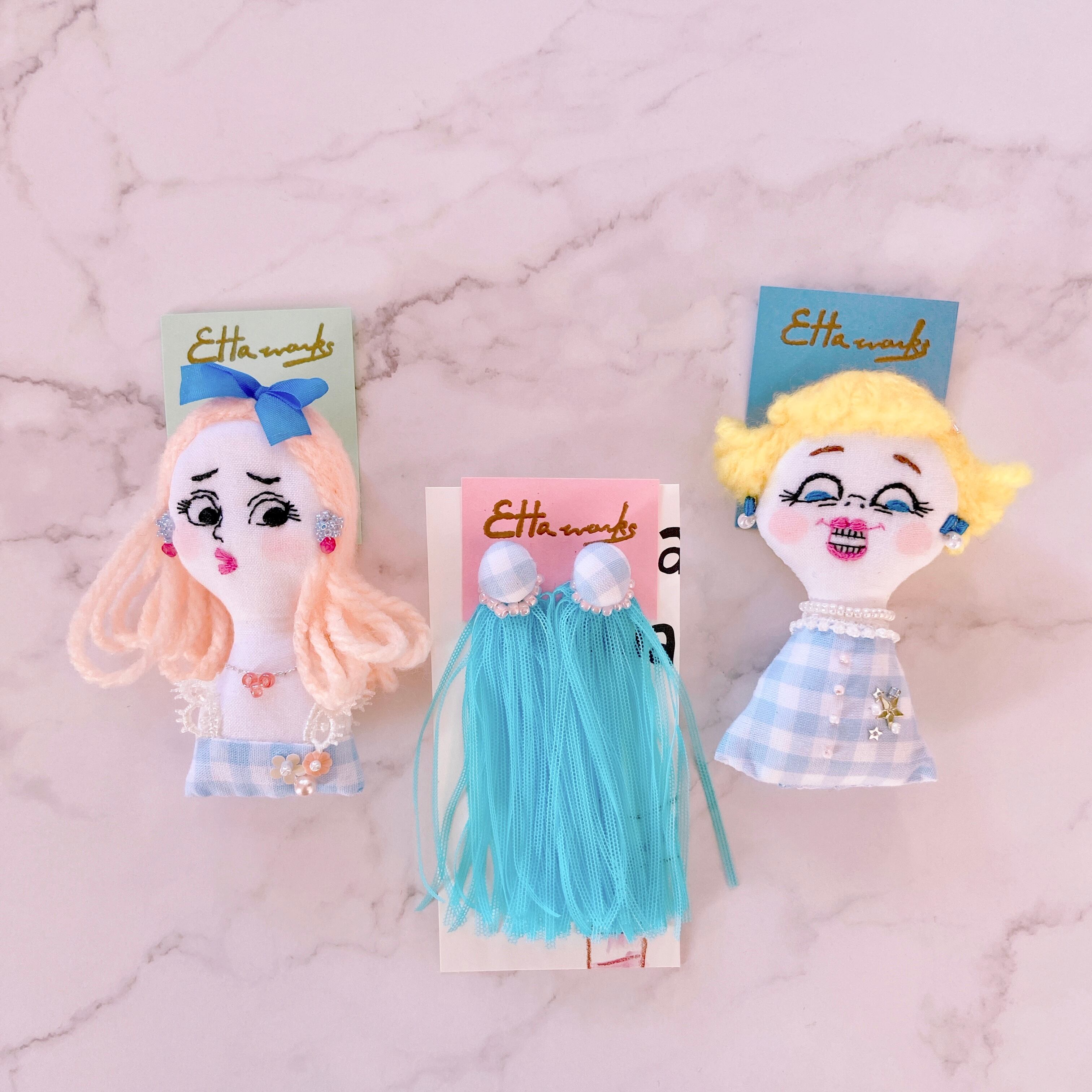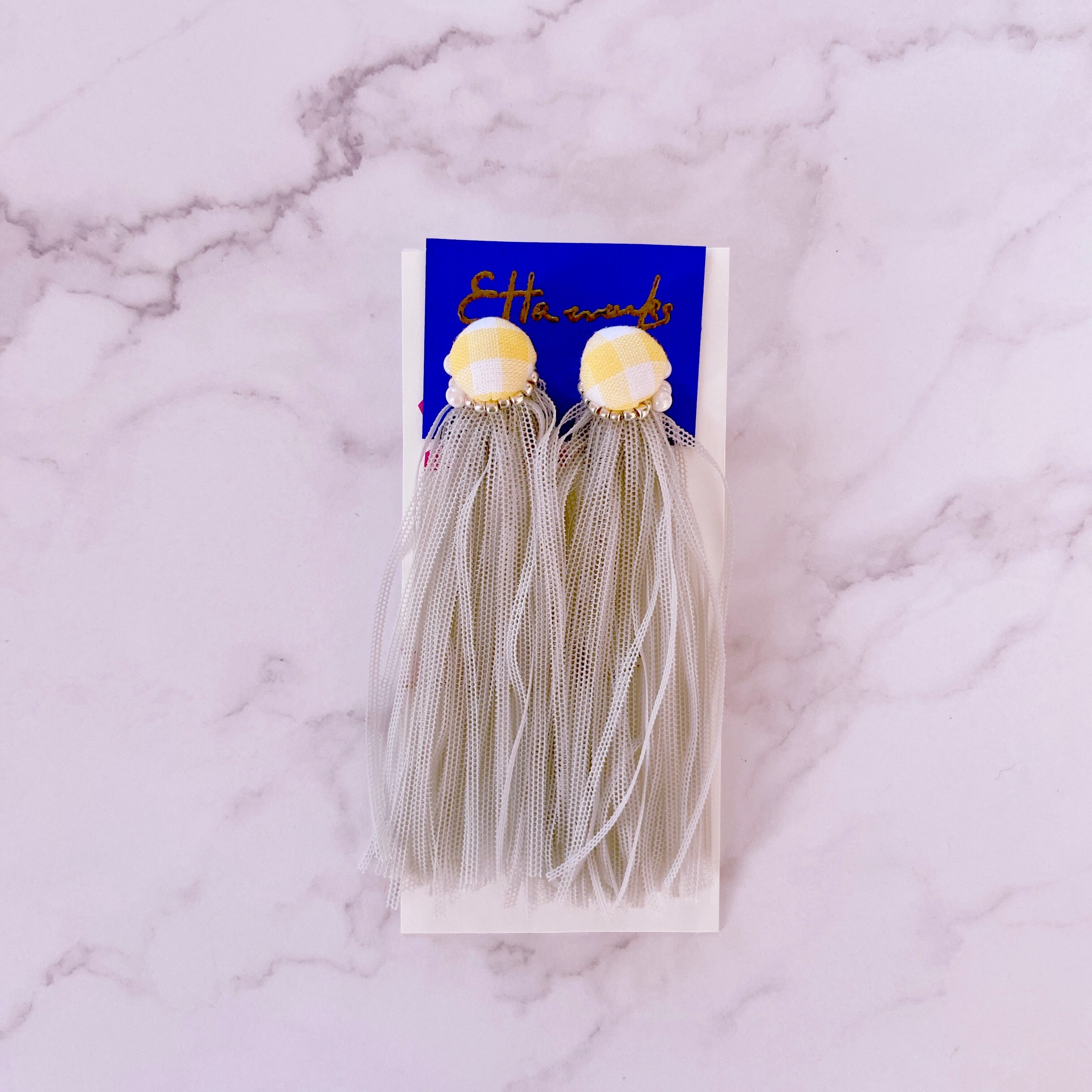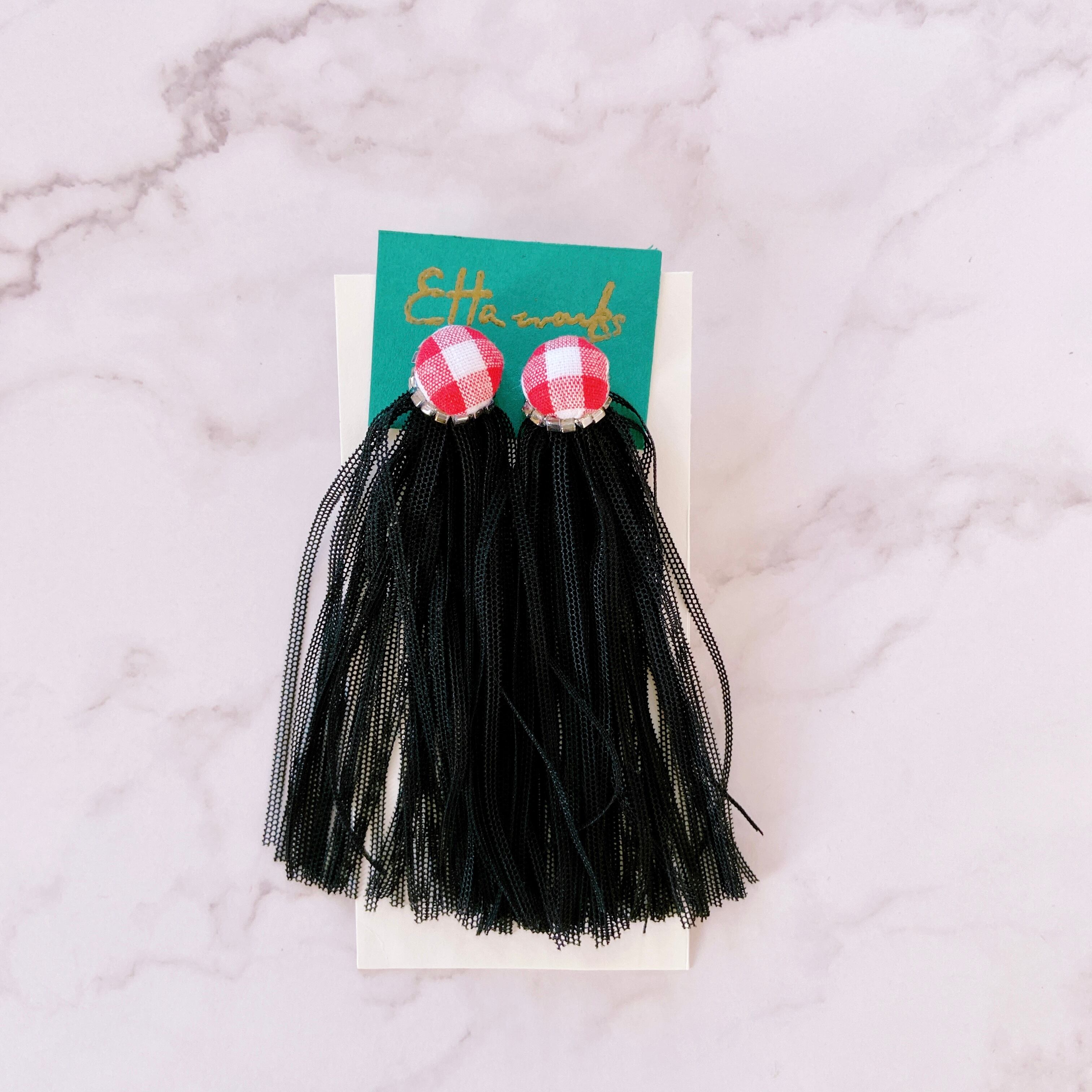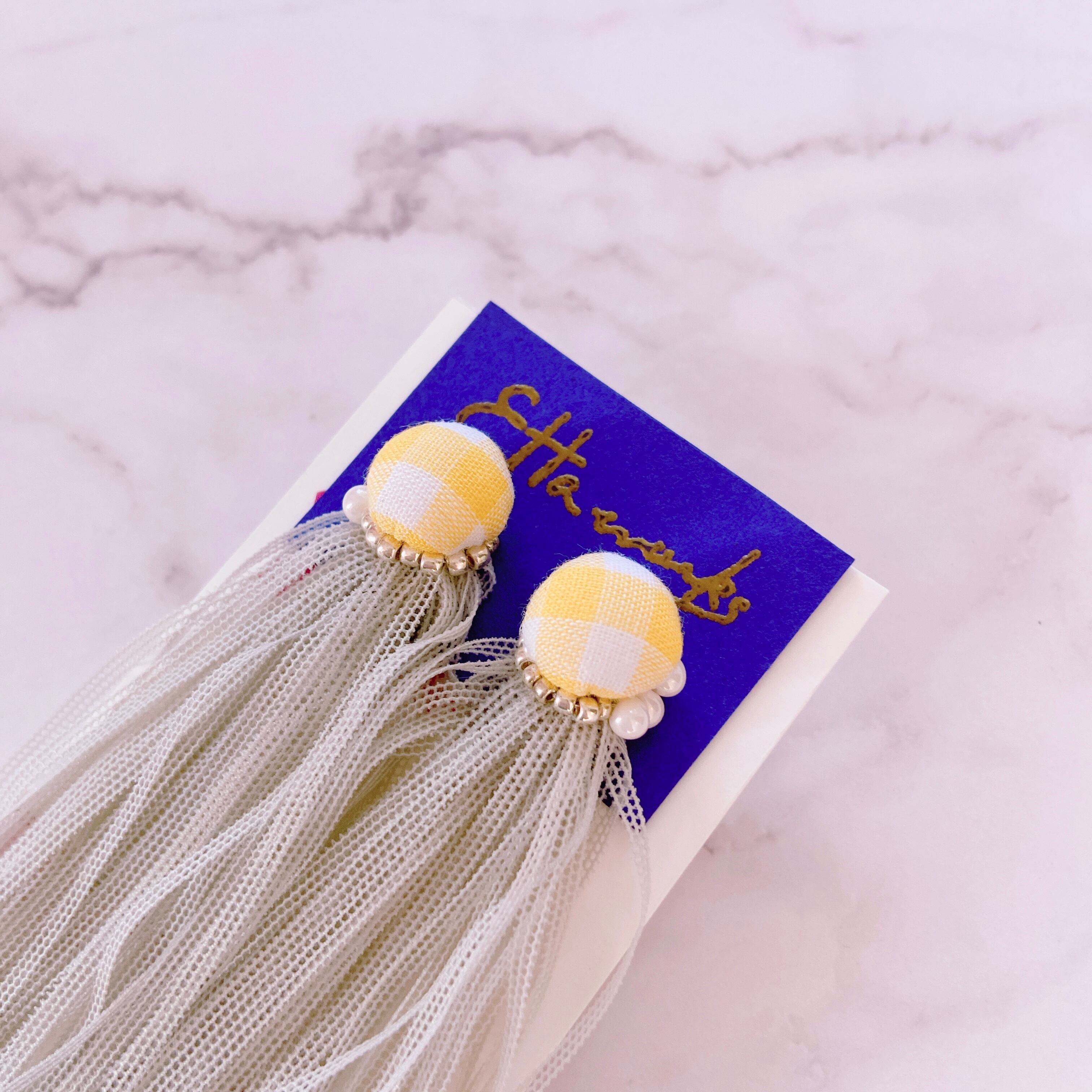 feveでも、もうすっかりお馴染みなマダムブローチのEtta worksさんの、チェックの可愛いポンポンとサラサラなカラフルフリンジのピアスです。