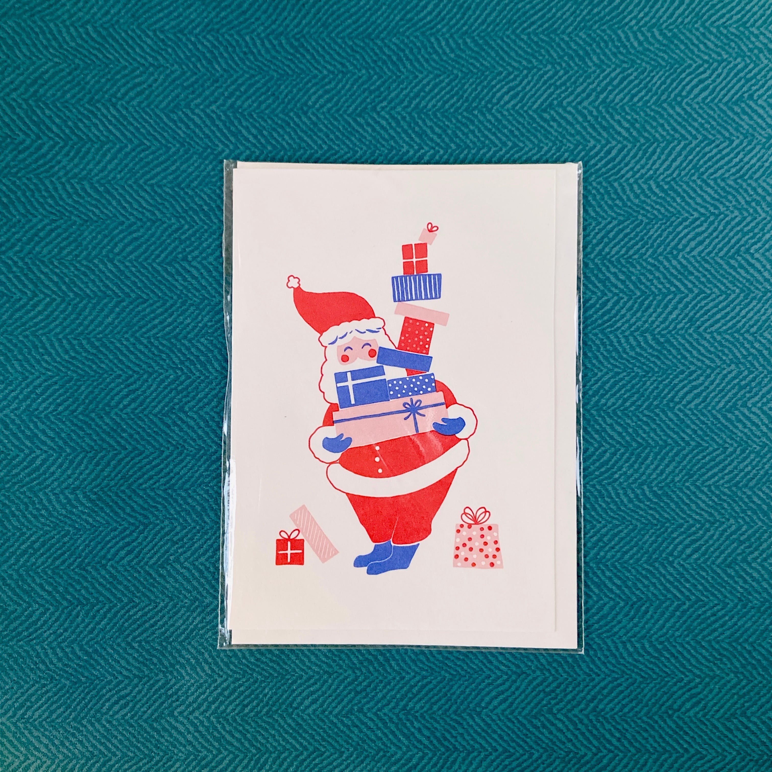 たくさんのプレゼントを抱えたサンタの笑顔がちょこっと見える、なんとも可愛らしいクリスマスカード。