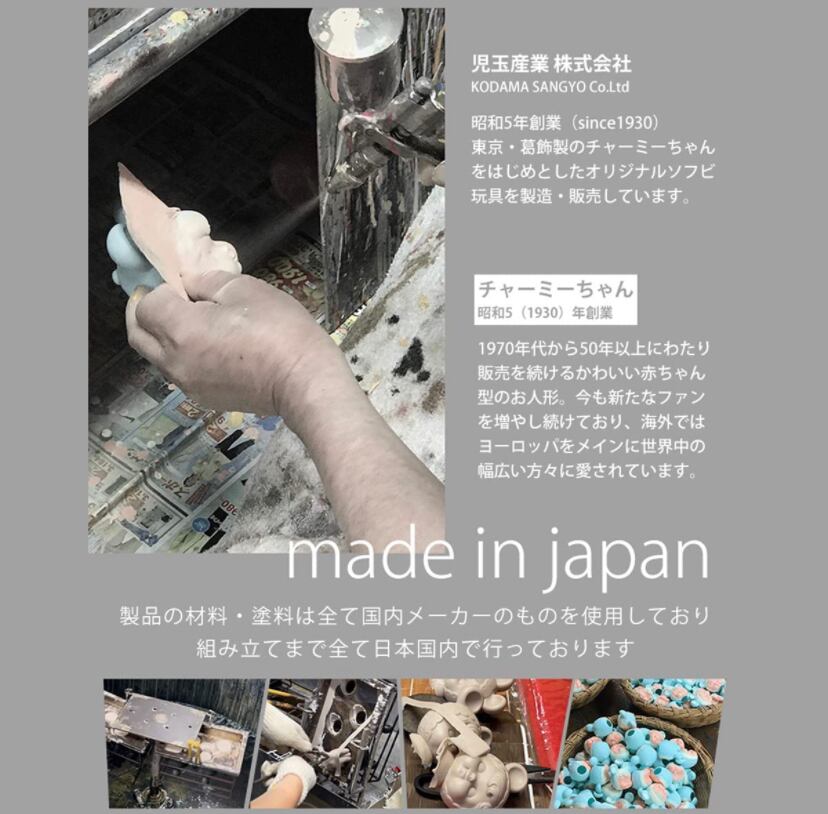 昭和40年代より東京・葛飾の児玉産業で製造を続けている昭和レトロなソフビ人形、チャーミーちゃん。