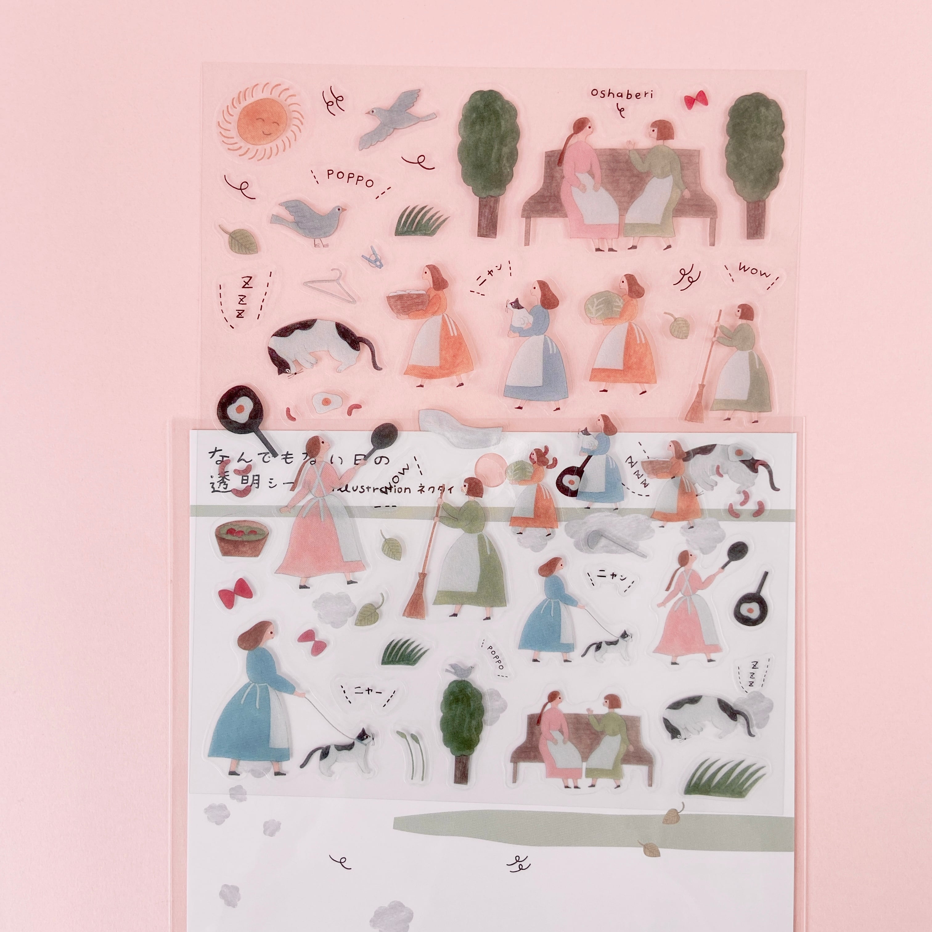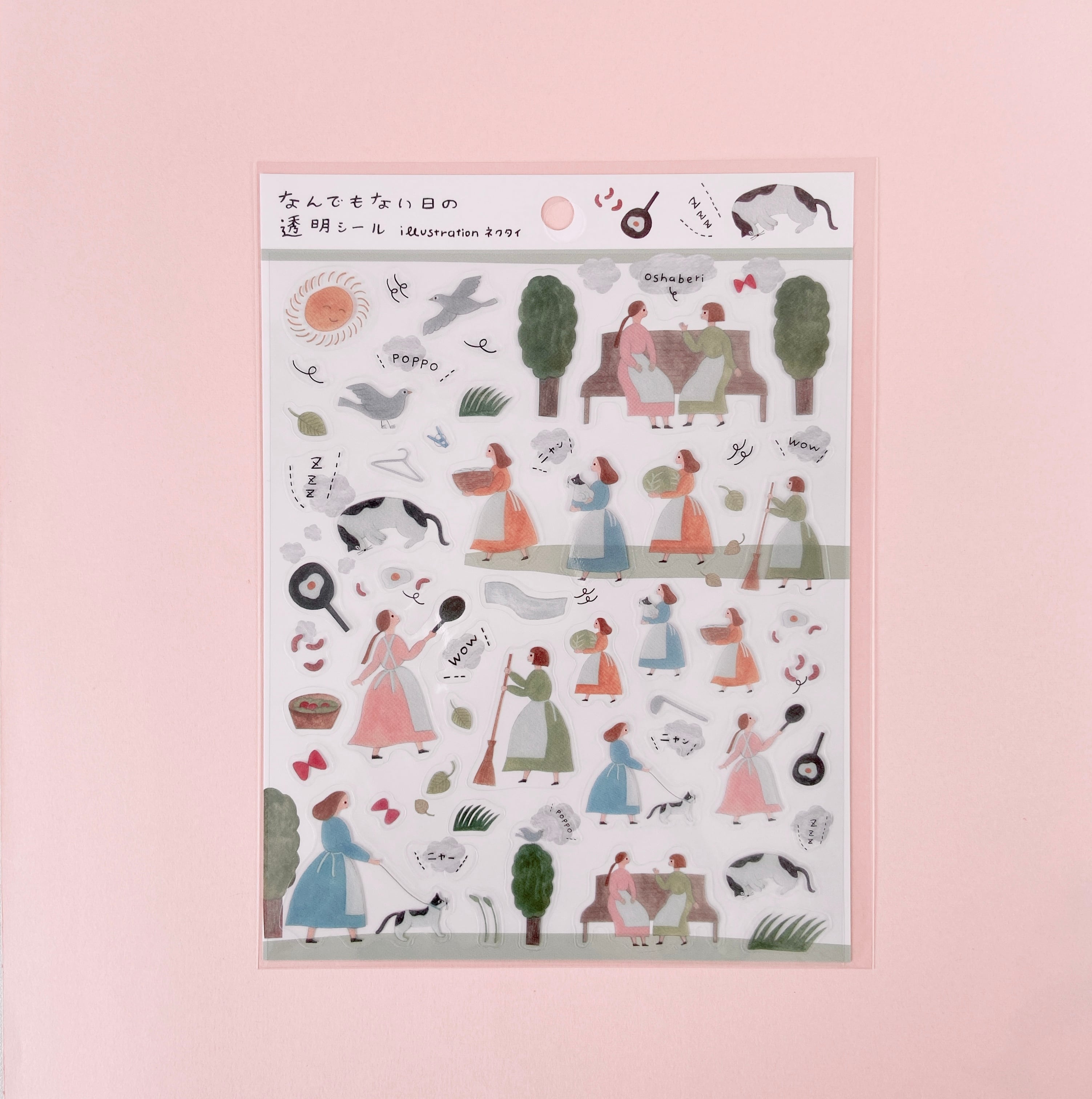 いつも通りの「なんでもない日」のシーンを描いた、いろんなサイズのかわいいシールです。
