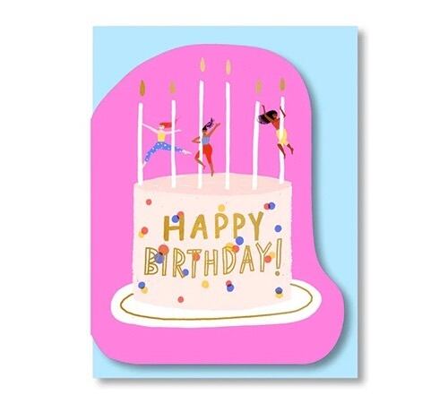 バースデーケーキの上にはアクロバティックな女性たちがにこやかに技を披露!