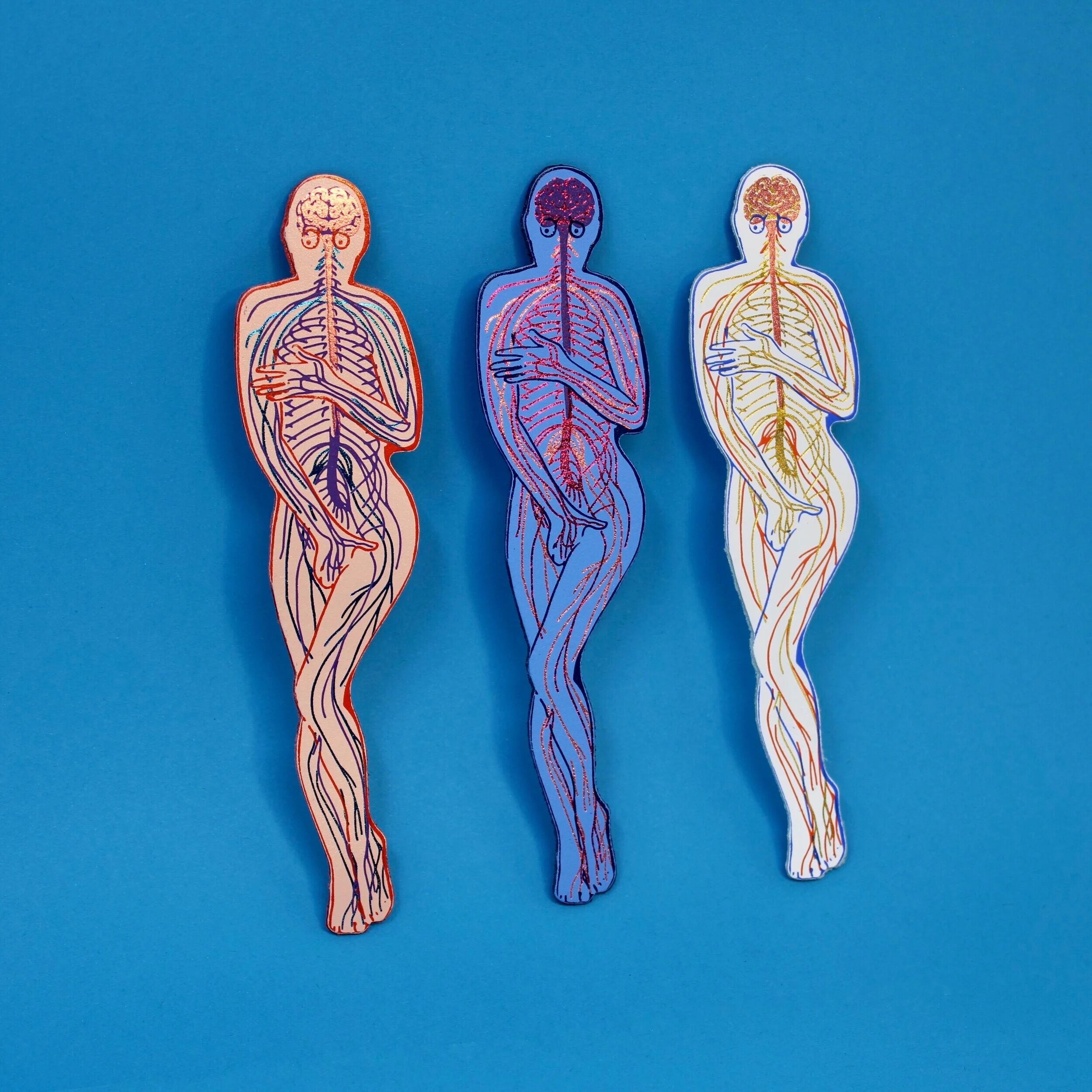 前側にはいや〜んポーズをしている神経丸見えの人が描かれ、裏面には、「緊張する必要はありません、内側はみんな同じです」という言葉が描かれています。